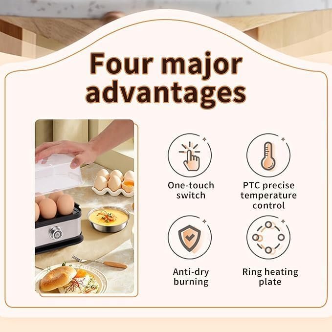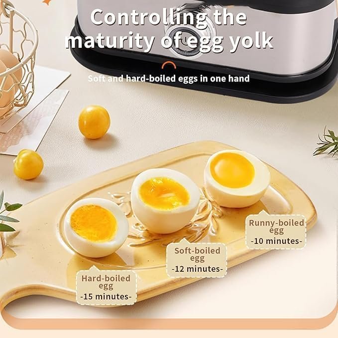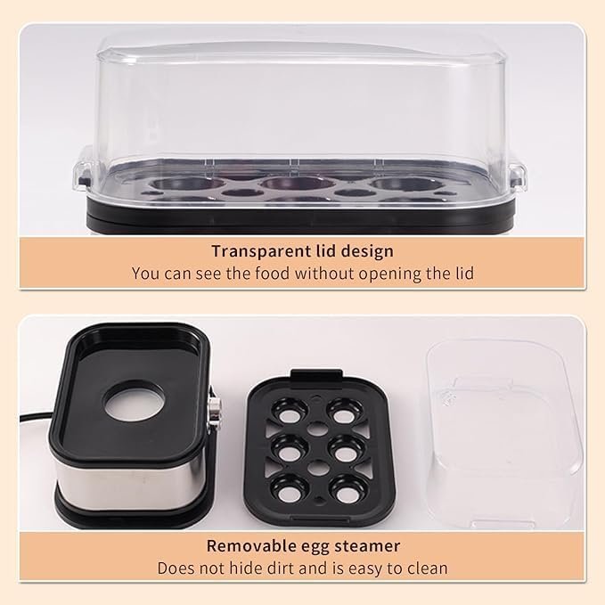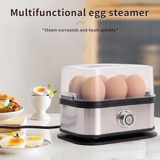 غلاية بيض ذكية من الستانلس ستيل، بسعة تصل إلى 6 بيضات، تعمل بتقنية البخار المتعددة الوظائف لمنع انفجار البيض. مثالية للاستخدام في المطبخ أو المكتب أو السكن، باللون الأسود الأنيق.